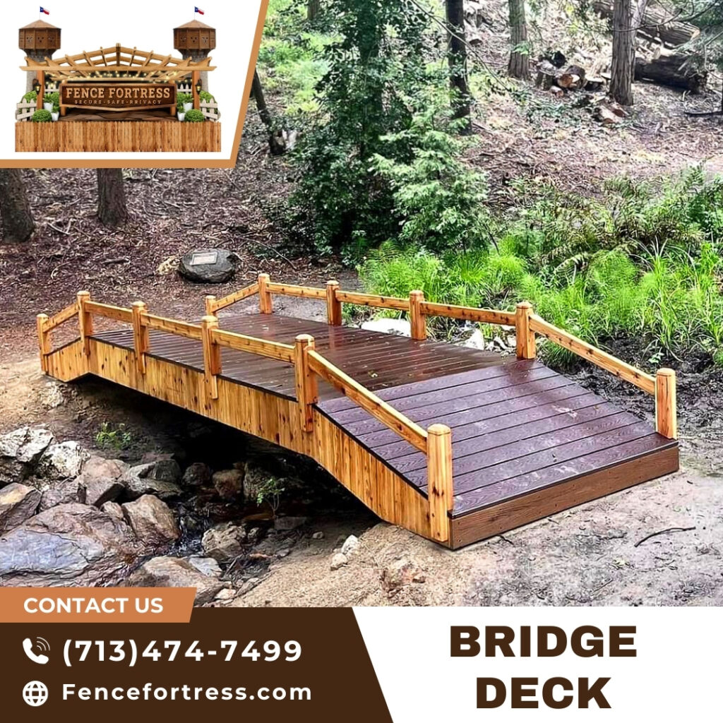 Fence Fortress specializes in designing and constructing Bridge Decks in Houston, providing homeowners with innovative solutions to connect different areas of their property. A Bridge Deck is an elevated platform that spans across a landscape feature such as a stream, ravine, or garden area, creating a functional and visually appealing connection between spaces. Whether you’re looking to enhance the aesthetic appeal of your outdoor space or improve accessibility, our Bridge Decks are crafted with precision and quality to ensure durability and beauty. Fence Fortress takes pride in transforming your landscape with Bridge Decks that not only serve a practical purpose but also add a distinctive architectural element to your property.